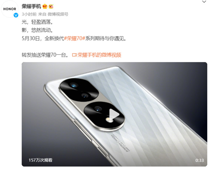 5月18日,荣耀手机官微宣布,全新换代荣耀 70系列新机将于5月30日19:30发布,并且还通过一则视频展示了新机的外观设计。根据预热视频,荣耀70流光水晶配色的背面加入了纹理设计,采用了来自于水晶的菱形纹理元素,而后置双圆环影像模组,内含3颗摄像头,主摄是5400万像素传感器,拥有1/1.49"大底、f/1.9光圈,整体外观简洁大方。