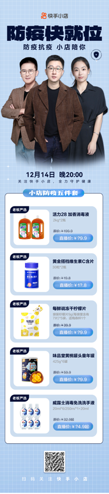 在本次防疫专场直播中,快手小店还与老铁们熟悉的快手达人连线,邀请他们亲自分享抗阳故事,从自身视角推荐实用必备防疫物资和恢复健康的方式。