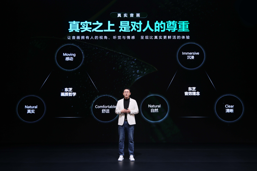 在画质系统上,东芝确立真实还原、视觉舒适、沉浸感动三大技术坐标——精准复现自然色彩与创作者意图,优化显示参数匹配人眼生理节律,消除屏幕边界感实现深度沉浸。在音频系统上,东芝构建沉浸声场、自然延展、清晰解析三维度量——构建360°全维声学空间,保证全频段声源准确还原,强化不同内容的细节呈现。