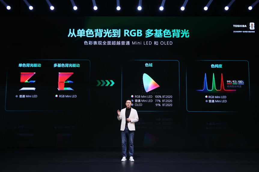 本次发布的核心技术——原色RGB Mini LED,是东芝在显示领域的又一次跨越式升级。不同于传统单色背光,东芝电视直接从光源底层出发,采用红、绿、蓝三色独立控制光源,实现接近100%的色纯度与最高110% BT.2020的超广色域,成为行业首个获得Pantone广色域与高立体色域双项认证的显示产品。
