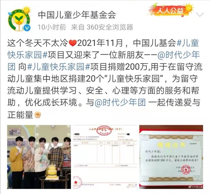 此外,在出道两周年之际,时代少年团更是全员齐聚快手,带来了一场既温馨又有意义的直播。直播中,成员们畅谈出道感受,爆笑完成任务接力挑战,连唱8首歌曲,与屏幕前的粉丝们热情互动。热闹之余,时代少年团还在直播间积极传递爱心,在直播中正式宣布向中国儿童少年基金会定向捐赠200万元,用于支持“儿童快乐家园项目”,为留守流动儿童提供学习、安全、心理等方面的服务和帮助,为更多孩子送去温暖,点亮希望。