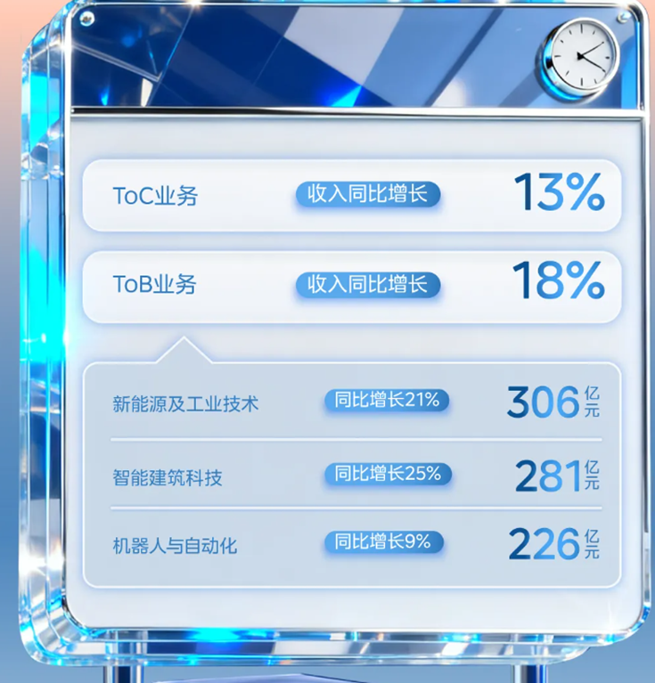 从业务结构看,美的集团的B端业务已成为重要的增长引擎。前三季度,公司To B业务收入同比增长18%,明显高于To C业务的增速。其中,新能源及工业技术收入306亿元,同比增长21%;智能建筑科技收入81亿元,同比增长25%;机器人与自动化收入226亿元,同比增长9%。这些数据表明,美的在多元化战略布局上已初见成效。