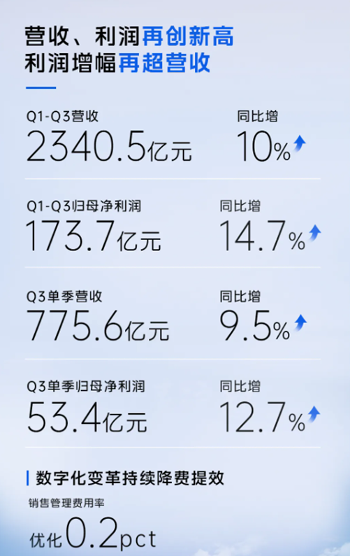 海尔智家今年前三季度实现了营业收入2340.5亿元,同比增长10%;归母净利润173.7亿元,同比增长14.7%,创下历史新高。第三季度单季,公司营业收入775.6亿元,同比增长9.5%;归母净利润53.4亿元,同比增长12.7%。海尔智家通过持续推进数字化转型与高端品牌建设,实现了利润增速高于收入增速的良好态势。