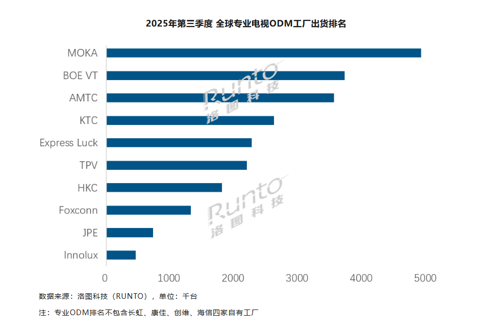 TCL茂佳早已是代工领域的领头羊。洛图科技数据显示,2024年以1670万台出货量蝉联冠军,2025年前三季度再以1310万台领跑,领先第二名超400万台,2025年收获全年第一应没有悬念。