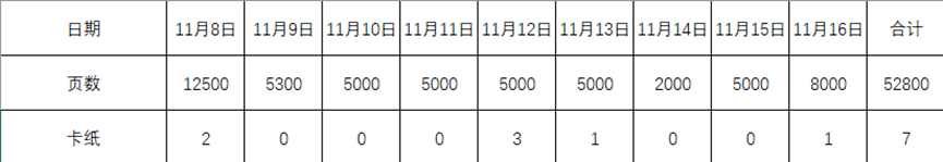 通过上表我们可以看到,在11月8日到11月16日为期9天的测试中,我们共打印了52800页标准测试文档,其中共出现过7次卡纸报错情况。