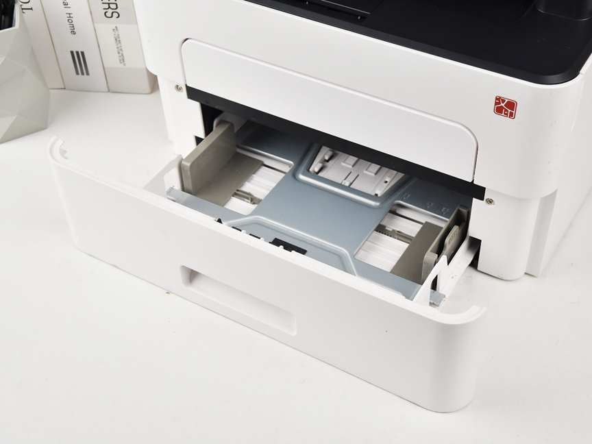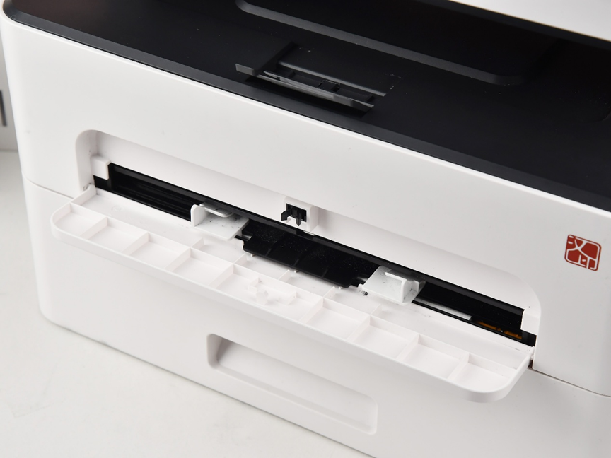 在机身中部下侧为该产品的手动送纸单元,该产品标称可兼容普通纸/厚纸/信封/明信片等材质60~190g/㎡的介质,而在机身底部为该产品的全封闭式纸盒,该纸盒标称可容纳250页普通复印纸,全封闭纸盒可有效防尘防潮外,如此大容量的纸盒更是提升了产品的续航能力。