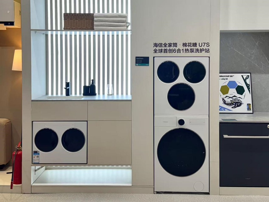 继2017年全球首创三筒洗衣机,到2025年全球首创4合1热泵洗烘一体机,3月5日,在“海信世界杯营销暨定制产品发布会”上,海信洗衣机再次发布颠覆性创新产品:全球首创6合1热泵洗护站——海信全家筒 · 棉花糖U7S四筒洗衣机,同步为年轻一代用户推出线上爆款新品——海信全家筒 · 大薄荷E5S四筒洗衣机。新一代全家筒首创集成在洗衣机里的洗鞋机,并跨越升级Ai宙斯热泵 3.0 技术,烘干效率提升32%,并以“自由组合 衣鞋同净”的颠覆性设计,在 0.5m³ 的空间内实现全家衣物、鞋子的0手洗|0等待|0 交叉,从分类、健康、护理、体验四大维度进行升级,让用户体验到 “从上到下、从里到外、从头到脚” 全身分区健康洗护躺平式自由。