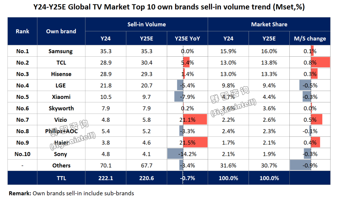 LG电视业务的困境,很大程度上源于中国竞争对手的强势挤压。钉科技注意到,群智咨询、奥维睿沃等机构数据显示,2024年以来TCL、海信等中国品牌已在全球电视出货量上超越LG,其市场份额面临持续下滑的危机。