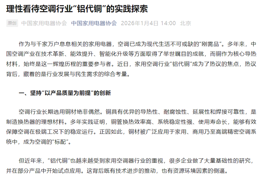 近期,随着铜价再次飙升并打破历史纪录,家用空调行业关于“铝代铜”的讨论再度成为焦点。这一热议背后,折射出的是中国家电产业在资源安全、成本控制与技术升级之间的多维权衡。