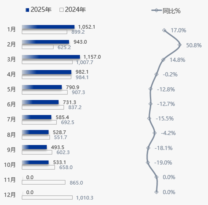 据产业在线监测数据显示,2025年10月中国家用空调生产1013.3万台,同比下滑27.9%,销售1027.9万台,同比下滑20.1%,其中内销规模494.8万台,同比下滑21.3%,出口规模533.1万台,同比下滑19.0%。在需求透支和成本挤压的双重压力下,10月份产销延续了9月的负增长趋势,市场阶段性调整特征凸显。