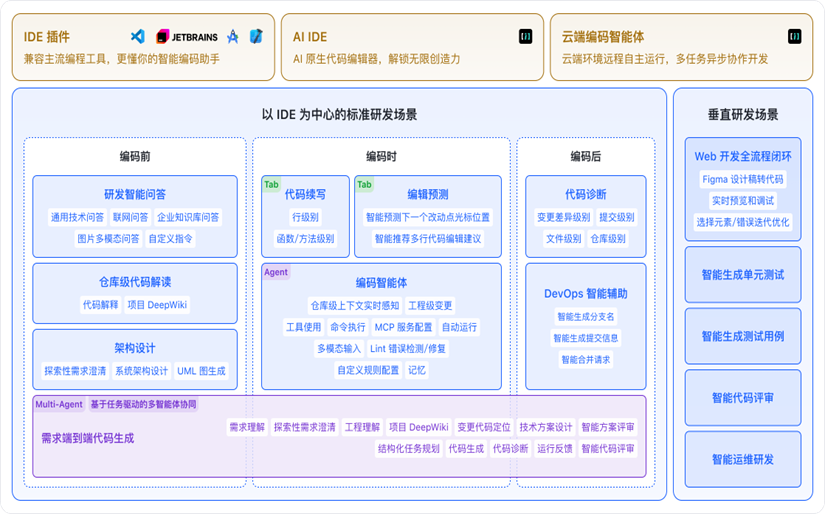 CodeFlicker 的能力贯穿软件开发生命周期,从编码前的智能问答与架构设计,到编码时的代码补全与智能体辅助,再到编码后的代码诊断和智能运维,为开发者提供无缝的 DevOps 端到端赋能。