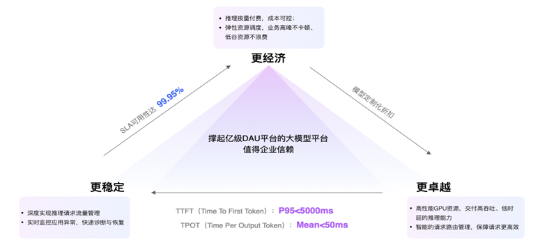 - 透明可控的成本:支持按量付费和弹性资源调度,结合极致的推理性能优化,帮助企业在业务高峰期从容应对,在业务低谷期节约资源,实现成本可控的 AI 应用落地。