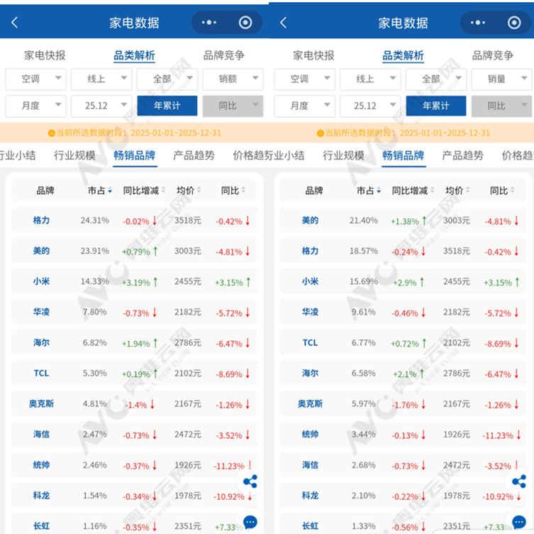 市场话语权始终紧握在传统巨头手中。奥维云网数据显示,线上销额TOP5为格力、美的、小米、华凌、海尔;线下销量与销额前列则是美的、格力、海尔、海信。无论渠道如何变化,主角始终是那些耳熟能详的老面孔。