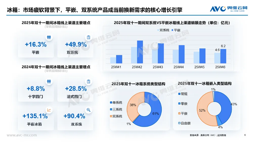 冰箱领域则呈现双重突破。钉科技注意到,双系统产品通过精准温区控制满足食材保鲜细分需求,而平嵌设计则以无边界美学打破传统冰箱的空间局限,两者分别实现49.9%和16%的同比增长。