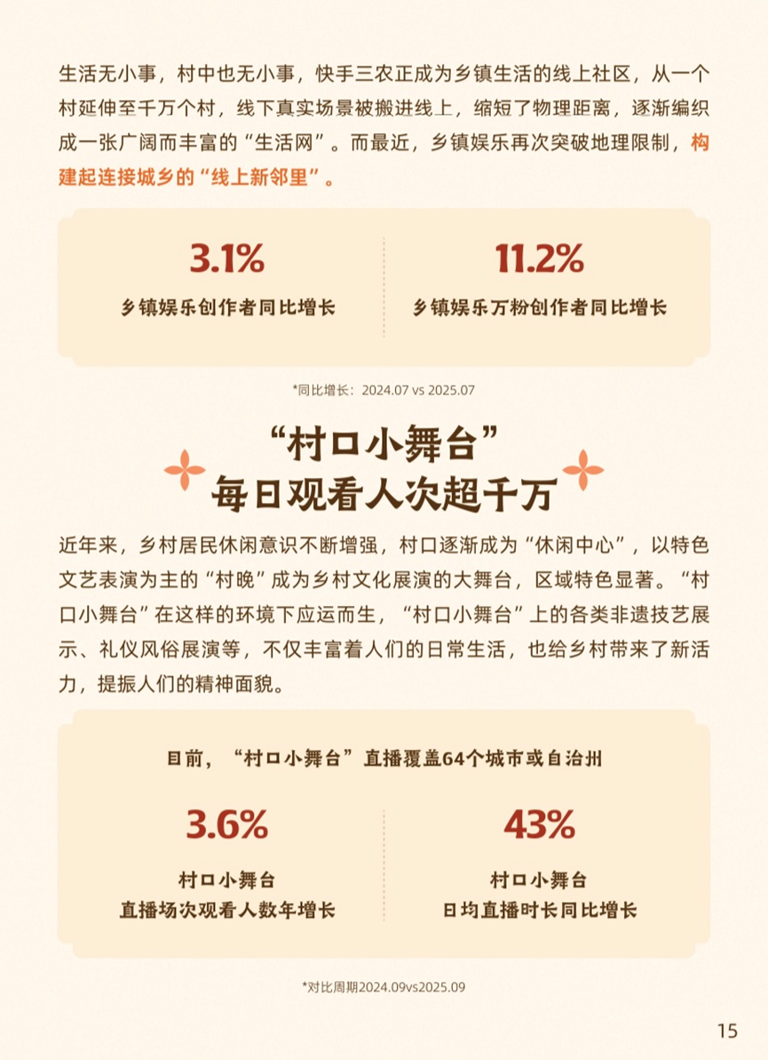 近年来,乡村居民的休闲需求日益旺盛,村口作为传统“休闲中心”的功能被重新激活,一种由农民自导自演、在村口搭台演出的“村口小舞台”模式逐渐兴起。过去一年,快手上的乡镇娱乐创作者数量同比增长3.1%。他们将直播间变为“新广场”,通过多样化的才艺展示丰富了乡村娱乐生活,让普通农民成为舞台的主角,为乡村文化振兴注入了新活力。