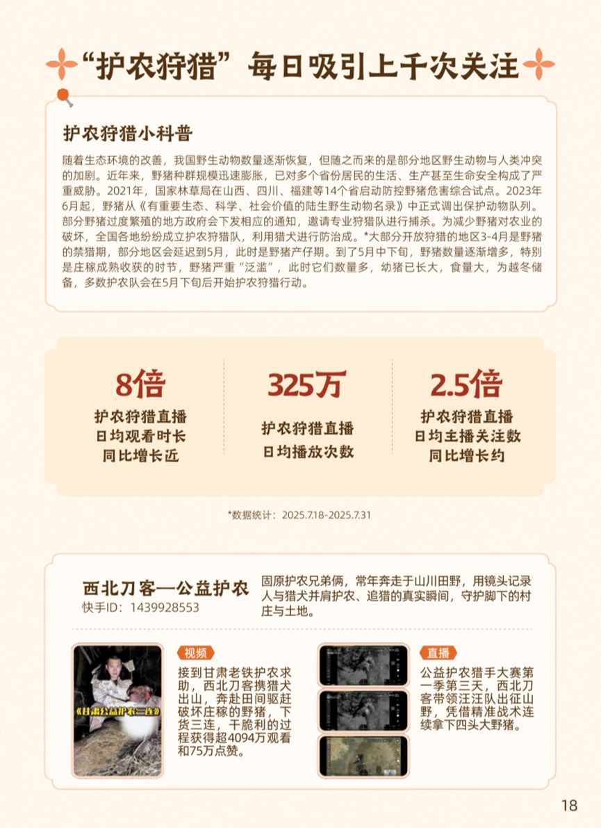 为减少野猪对农业的破坏,全国各地纷纷成立护农狩猎队,他们通过直播的形式记录每一次的守护行动,每日吸引上千次关注。报告提到,过去一年,快手上的“护农狩猎”直播日均观看时长同比增长近8倍,日均播放次数325万。@西北刀客—公益护农 @户外战队阿勇 @西北老王 等护农狩猎主播携“汪汪队”出征山野,守护脚下的村庄与土地的同时,也收获了大量粉丝。