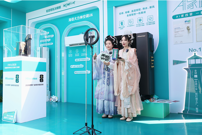 除了精彩纷呈的互动体验,现场还展出多款2026美加墨世界杯定制空调产品。其中,海信大力神空调U6自发布以来,便以“超大新风 神机妙算”的核心体验,成为高端家庭焕新空调的首选。作为全球首款搭载星闪人感2.0技术的新风空调,海信大力神空调能实时捕捉人体具体方位与活动轨迹,实现风随人动、风避人吹、人近柔风、无人节能等智能送风,将健康舒适的空气体验推向全新高度。而现场展出的海信空调智慧风A6系列则配备御风盾340°全面控风系统,900m³/h澎湃大风量让全屋没温差,一键AI智省电最高省电41%,实现“星闪人感智慧风 风量又大又聪明”的送风体验。