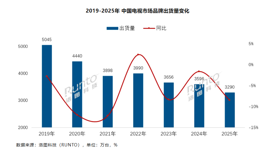 2025年,国内电视市场寒意逼人。洛图科技数据显示,2025年全年,中国电视市场品牌整机的出货量为3289.5万台,同比2024年下降8.5%,创下16年来的新低。