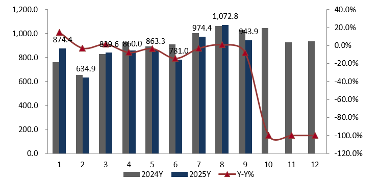 产业在线数据显示:2025年9月彩电产量1259万台,同比下滑8.3%,销量1250万台,同比下滑8.5%;其中出口944万台,内销306万台,分别同比下滑8.2%和9.3%。累计来看,1-9月份彩电生产10393万台,同比下滑3.3%,销售10326万台,同比下滑3.1%,其中出口7844万台,内销2482万台,分别同比下滑2.8%和4.2%。内销市场环比虽有上扬,但增长主要由季节性因素驱动,并非终端需求的实质性改善。一方面消费市场持续低迷,另一方面手机平板等设备成为客厅场景下彩电的主要替代品,分流了用户使用时长,双重因素共同导致内销市场持续走低;受关税带来的成本压力以及去年同期高基数的影响,出口市场同样出现承压的趋势。