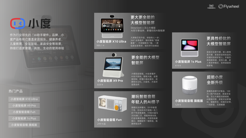 小度是AI助手硬件领域的先行者,产品矩阵全面覆盖家庭娱乐、健康养老、儿童教育、全屋智能、家庭安全等全场景,持续迭代更便捷、高效、生动的智能体验;从AI双引擎加持、360°全景看护、一屏搞定全家娱乐学习的大屏全能款小度智能屏 X10 Ultra,到大模型深度赋能、全语音控制、AI全天守护的小度智能屏 X9 Pro,再到语音交互更流畅、家庭安防、影音娱乐全满足的高性价比款小度智能屏 1S Plus,主打DIY拼装潮玩、打造专属桌面氛围感的个性潮玩款小度智能音箱 Fun,以及百万用户之选、家庭百宝箱、一问即答的家用爆款小度智能音箱旗舰版,小度以多形态产品精准匹配从老人到孩子、从客厅到卧室的全家全场景需求,更针对语音识别、内容丰富度、数据安全等核心痛点深耕优化,用AI点亮每一个家庭的智能生活。