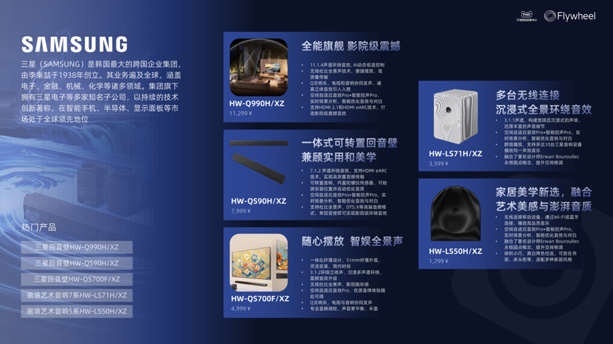 三星作为业务遍及全球的跨国企业集团,以持续的技术创新在各领域保持全球领先地位,三星电视连续20年全球出货量第一。2017年三星电子收购哈曼国际,拥有了包括JBL、哈曼卡顿及后续的宝华韦健、天龙等一系列高端音响品牌资产,拥有世界一流的声学调校实验室及先进的声学技术。其音频产品线延续了“科技赋能体验”的基因,围绕家庭影音场景打造多元化解决方案。HW-Q990H/XZ以高质量立体音效打造影院级震撼,HW-QS90H/XZ兼顾实用与美学,HW-QS700F/XZ实现随心摆放的沉浸体验,HW-LS71H/XZ凭借多台无线连接构建全景环绕,HW-LS50H/XZ则融合艺术设计感与澎湃音质,适配多种家居风格。三星通过差异化声学架构适配不同空间与场景需求,消解传统家庭影院的复杂布线与调试门槛,实现视听一体化的无缝体验。