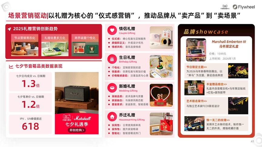 礼赠场景正从传统节日促销演变为品牌构建仪式感营销的核心阵地,淘天以“场景营销驱动+仪式感营销”为核心策略,推动品牌从“卖产品”向“卖场景”跃迁。2025年礼赠营销呈现出节点常态化、场景多元化与跨界个性化三大趋势,七夕节音箱品类的爆发式表现印证了礼赠场景对消费力的强劲拉动。品牌围绕情侣、生日、新婚、乔迁四大核心礼赠场景,分别从仪式感、个性化、品质感、实用性切入,精准匹配用户情感需求。