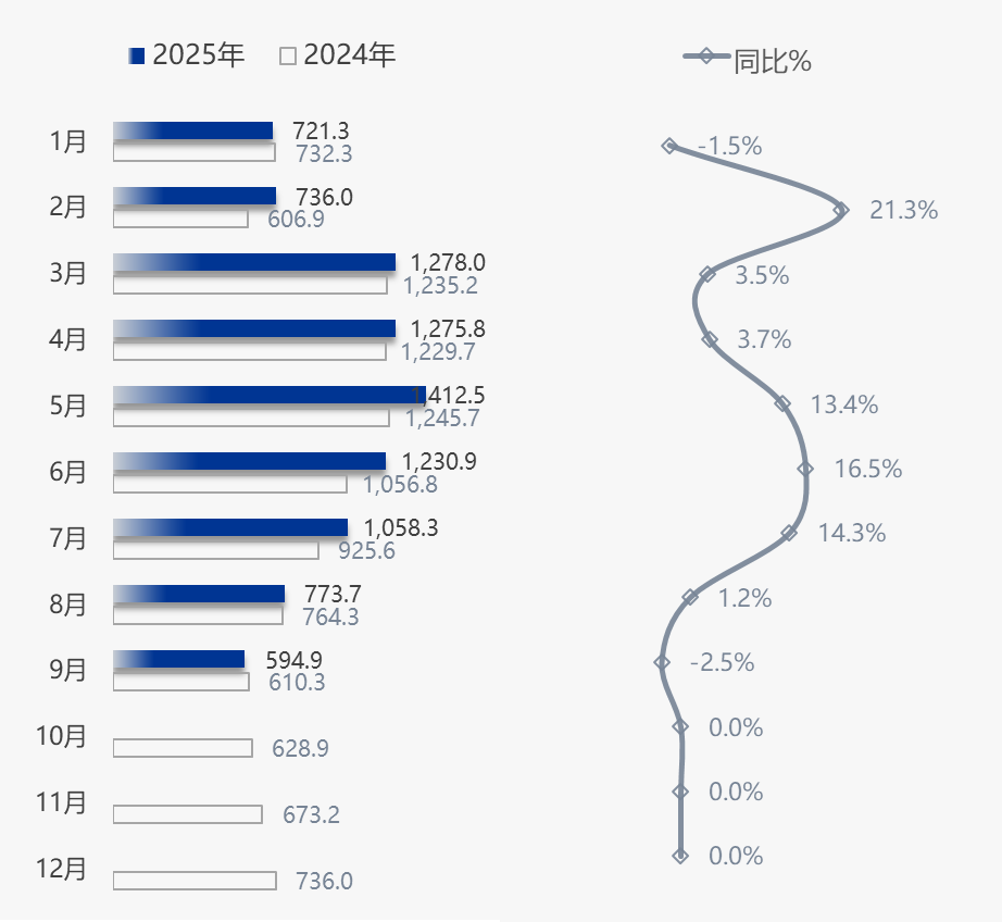 据产业在线监测数据显示,2025年9月中国家用空调生产1056.7万台,同比下滑13.5%,销售1088.4万台,同比下滑10.2%,其中内销规模594.9万台,同比下滑2.5%,出口规模493.5万台,同比下滑18.1%。在政策衔接、需求变化以及季节性等多重影响叠加下,9月空调产销双双下滑,短期内承受一定压力,但长期来看市场正在经历结构化的转型升级,行业仍在加速洗牌中。