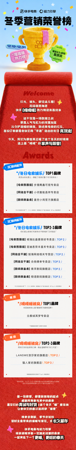 延续活动第一阶段热度,2025年12月19日-31日,快手“嘎嘎暖”年终热力榜排位赛正式开启,面向家纺和3C数码行业商家,打造多样玩法,并投入黄金热搜位、多入口引流资源位、平台黄金广告位等顶级资源,通过流量扶持、荣誉认证、全网曝光等多维赋能,帮助商家锁定行业高光时刻、冲刺年终生意新高。