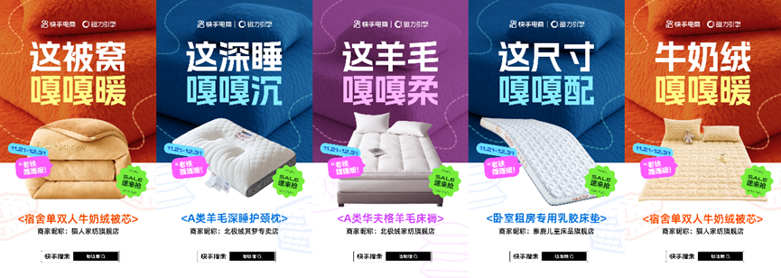 锚定冬季保暖消费需求,快手电商通过打造“老铁,这被窝嘎嘎暖!”场景化营销活动,从创新玩法、多元政策、全域资源等多维度协同发力,高效激发家纺市场增长动能,助力商家实现年终生意高效爆发。