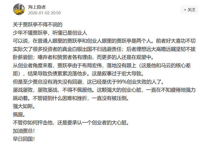 一位自称创业者的用户分享道:“少年不懂贾跃亭,听懂已是创业人。”这句话被反复引用,成为许多评论的注脚。突然之间,贾跃亭的形象从一个“失败的商人”转变为了“坚韧的追梦者”。