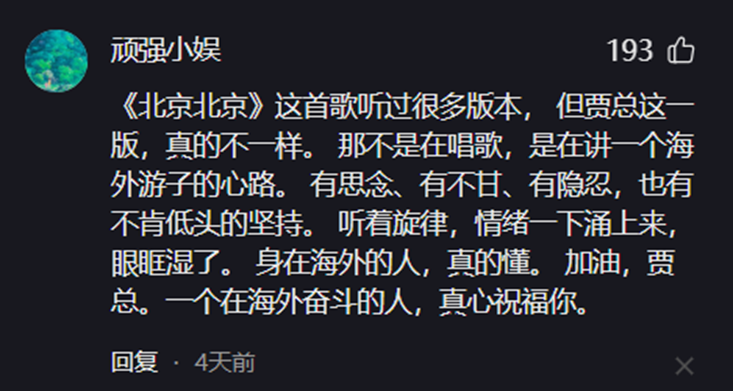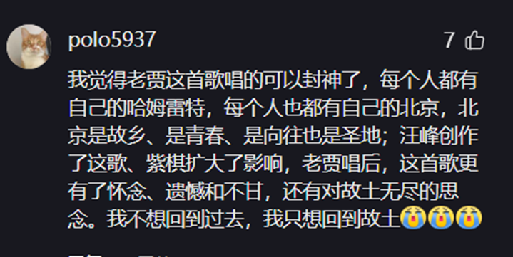 在贾跃亭翻唱《北京北京》的语境中,“北京”已不仅是一个地理概念,而成为故乡、青春、理想和遗憾的多重象征。“每个人都有自己的哈姆雷特,每个人也都有自己的北京,北京是故乡、是青春、是向往也是圣地。”一条评论如此解读。