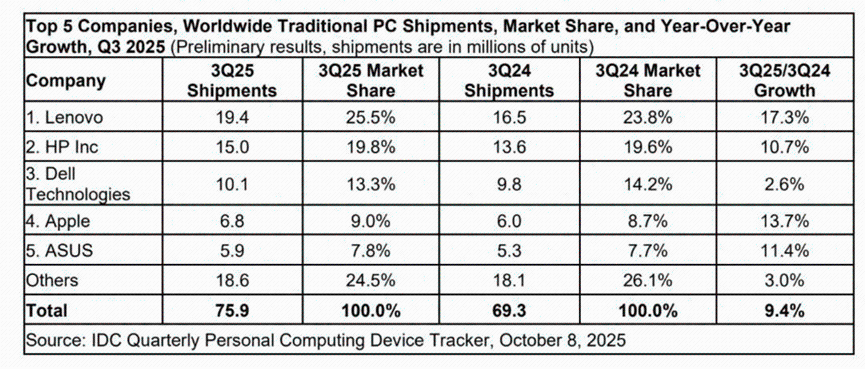 从市场格局看,惠普的份额颓势已持续显现。IDC数据显示,2025年第三季度全球PC出货量增长9.4%,但联想以1940万台出货量、25.5%的市占率稳居第一,同比增速高达17.3%,远超市场均值;而惠普以19.8%的市占率位列第二,与联想的差距拉大至5.7个百分点。另外,联想25/26财年Q1业绩报告显示,其AI PC出货量已占整体33%,Windows AI PC市场份额稳居全球第一,这种技术代差正不断蚕食惠普的市场空间。