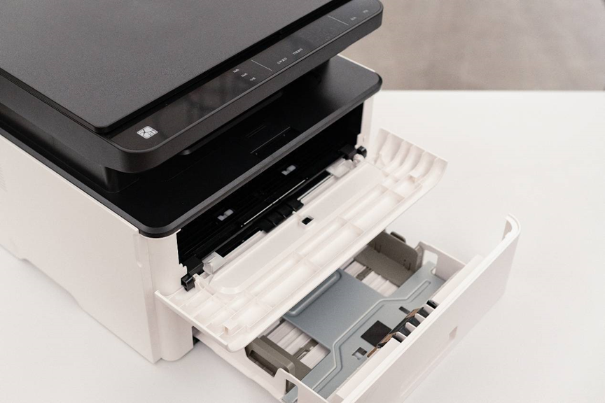 汉印TG1000MD的正面从上到下分别是扫描仪、控制面板、出纸口、硒鼓仓、手动进纸仓和自动进纸仓。其中控制面板采用了电容触控按键+LED数显屏的设计,颜值相比实体按键要高很多;自动进纸仓内部支持手动调整纸张限位,并且最多可容纳250张A4纸。