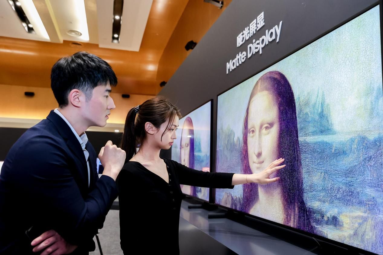 在品鉴会现场,三星画质专业工程师以The Frame画壁系列电视为例,形象地向与会嘉宾展示了哑光屏显的优越性。三星在屏幕表面应用凹凸结构,可将面板表面的光线散射到不同的角度,极大减少环境光反射和眩光,因此能够精准控制屏幕亮度,减少色彩偏移和画面失真。使得电视不论是在耀眼的阳光下还是明亮的室内光照射下,都能呈现出鲜活艳丽的饱和度与纯粹深沉的黑色,让用户沉浸在清晰逼真的视觉享受中。三星的哑光屏显还获得了全球安全认证公司 UL(Underwriters Laboratories)的“无眩光”认证,为其先进的技术力提供了强力支持。The Serif画境系列艺术电视同样采用了哑光屏显技术。