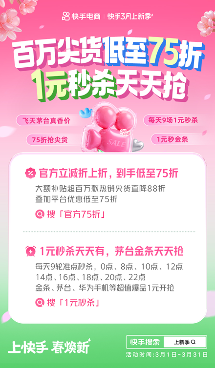 春焕新,购好物。3月1日,以“上快手 春焕新”为主题的快手3月上新季宣布正式开售,不仅有百万尖货破价直降88折、官方立减到手低至75折,还有大牌好货1元秒杀,每天9轮天天开抢。据悉,此次快手上新季活动将贯穿整个3月,以更简单直接的优惠玩法和丰富的尖货好物,和用户共同开启春日焕新购物季。