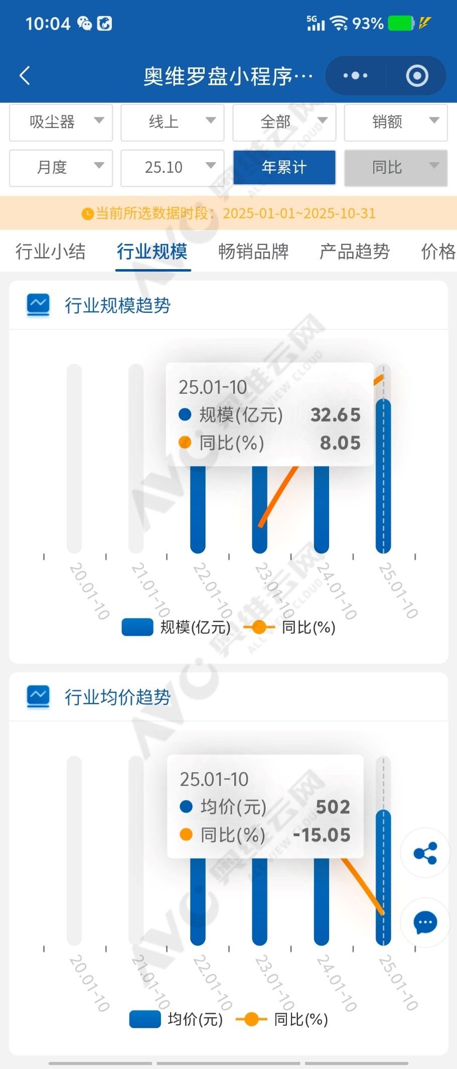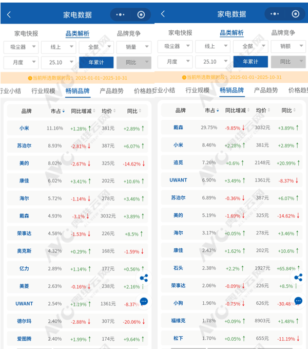 奥维云网数据显示,2025年1月至10月,国内线上吸尘器市场呈现出显著的结构性变化。钉科技注意到,一方面,以戴森为代表的高端品牌仍占据价格高地,但市场占有率明显收缩;另一方面,国产品牌在销量与高端化两条路径上同时发力,展现出强劲的增长潜力与市场适应性。