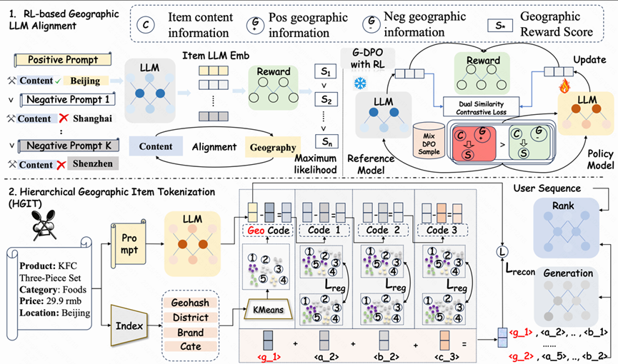 只有同时满足“离得近”和“感兴趣”,推荐结果才有可能转化为线下到店与交易。因此,快手生活服务算法团队引入大语言模型对Item进行高质量的文本语义与地理语义联合偏好建模,并通过基于强化学习的后训练范式,缓解预训练 LLM 中普遍存在的“重语义、轻地理”先天偏置,从而使内容表征更加充分地适配生活服务推荐场景。