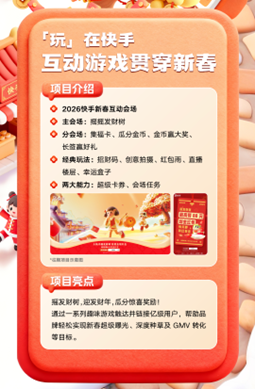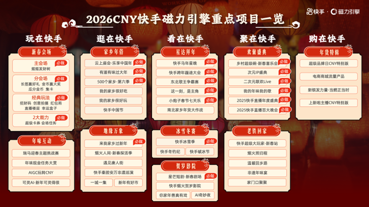 春节作为中国最盛大的传统节日,是快手用户活跃的高峰期,更是品牌不容错过的关键营销节点。近日,快手2026春节招商项目通案正式发布,围绕“玩、逛、看、聚、购”在快手,打造马年新春超级互动和内容盛宴,同时集结聚星达人、品牌产品、营销科学等丰富资源,为用户营造热闹喜庆年味氛围,为品牌搭建新春营销高光舞台,携手共迎温暖欢腾的中国年。