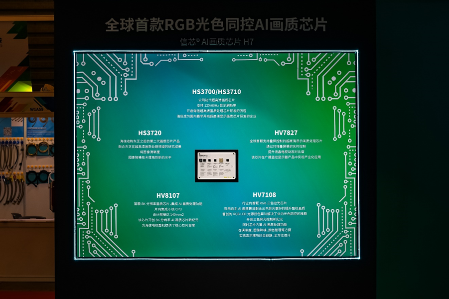 推动RGB光色同控技术突破的关键在于信芯AI画质芯片H7和RGB-Mini LED发光芯片的应用,海信自研AI画质芯片H7首创RGB光色同控算法,支持行业量产最高的3 x 10240分区控制,实现行业最高的108bits控色精度,配合高性能RGB-Mini LED发光芯片,彻底解决了三原色LED产业化中“发光效率低、寿命短、色偏”等行业难题,确保海信独创的RGB三维控色液晶显示技术及产品率先走向全球市场。