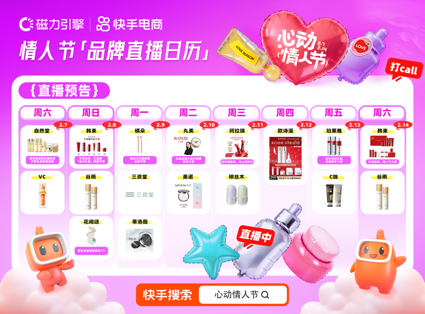 随着情人节的临近,情侣礼赠消费需求集中爆发。在众多消费品类中,美妆作为传递情感、表达心意的重要载体,成为情人节消费的大热选择。为满足用户的节点消费需求,从2月7日至14日,快手电商联动各大美妆品牌开启以“新春焕新颜,大牌礼赠意中人”为主题的心动情人节活动,带来宠粉补贴等超多优惠,以及主题品类日等丰富玩法,打造一场情人节美妆消费狂欢。