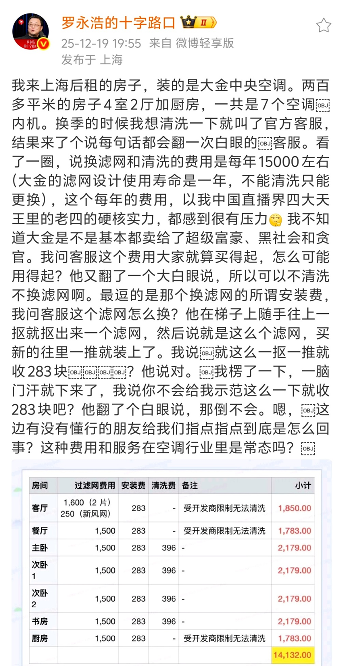 据悉,罗永浩在为租住房屋的7台大金中央空调内机申请清洗服务时被告知,因滤网“设计寿命一年”且“不可清洗只能更换”,年度维护成本高达约1.5万元,以至于他坦言以他的经济实力也感到有压力。