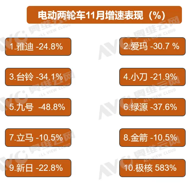 根据奥维云网(AVC)监测数据显示,2025年11月,我国电动两轮车行业生产量约为249万台,同比下滑29.1%;总销量约为244万台,同比下滑27%。其中,更能直接反映国内市场需求的内销出货量为221万台,同比下滑28.7%;出口量为22万台,同比下滑3.9%。这一系列陡峭的下降曲线,清晰地揭示新国标切换初期给市场带来的强烈冲击波。值得注意的是,在普遍下滑的基调中,专注于高性能电摩赛道的品牌“极核”实现了接近600%的逆势增长,成为了黯淡数据中一抹独特的亮色,也暗示了市场细分需求的强烈存在。