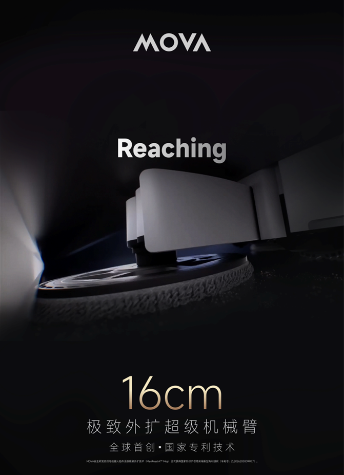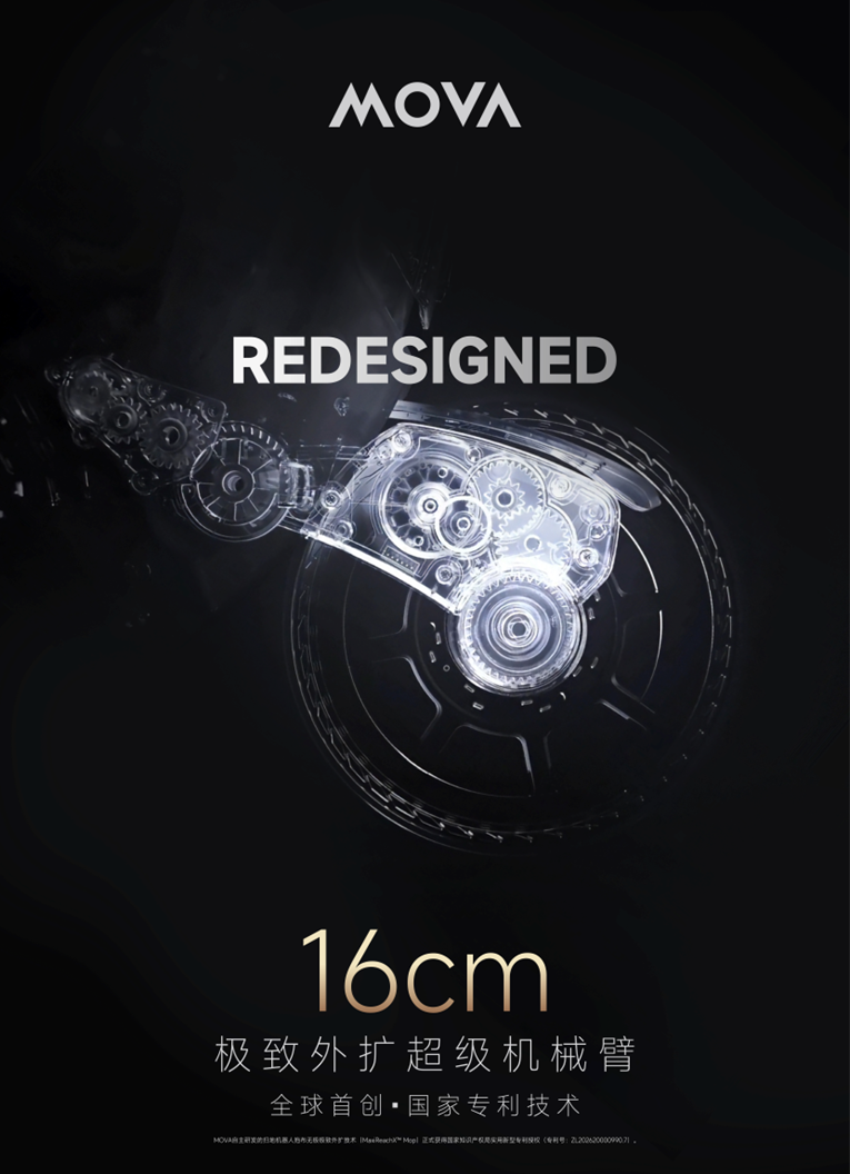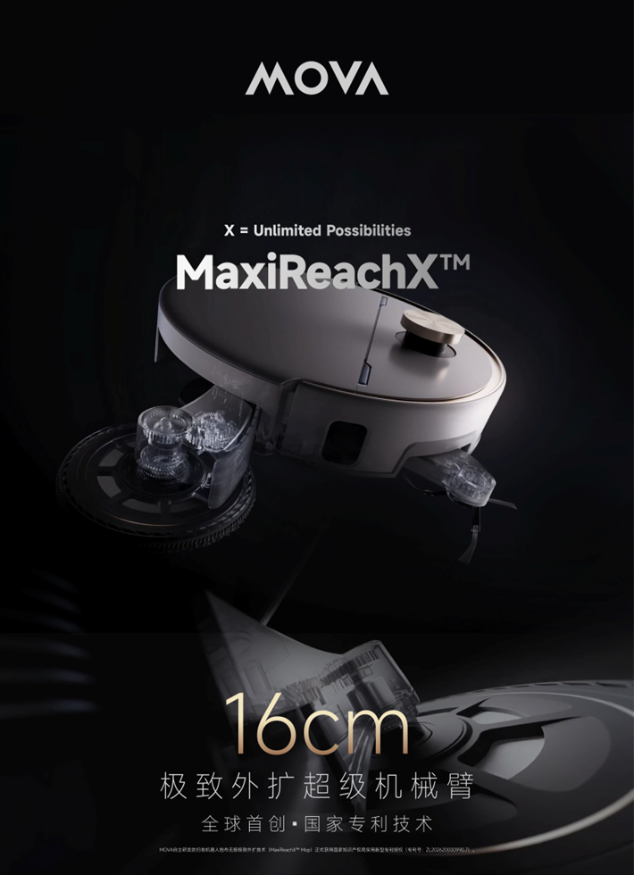 近日,全球高端创新智能家电品牌MOVA自主研发的扫地机器人拖布无极极致外扩技术(MaxiReachX™ Mop)正式获得国家知识产权局实用新型专利授权(专利号:ZL202620000990.7)。该技术以全球首创的16cm极致外扩超级机械臂为核心,首次在扫地机器人领域建立了可脱离机身限制进行地面清洁的技术路径,使扫地机器人的清洁方式从“机身进入空间”转向“清洁结构主动延伸进入空间”,让清洁单元不再受限于整机尺寸。